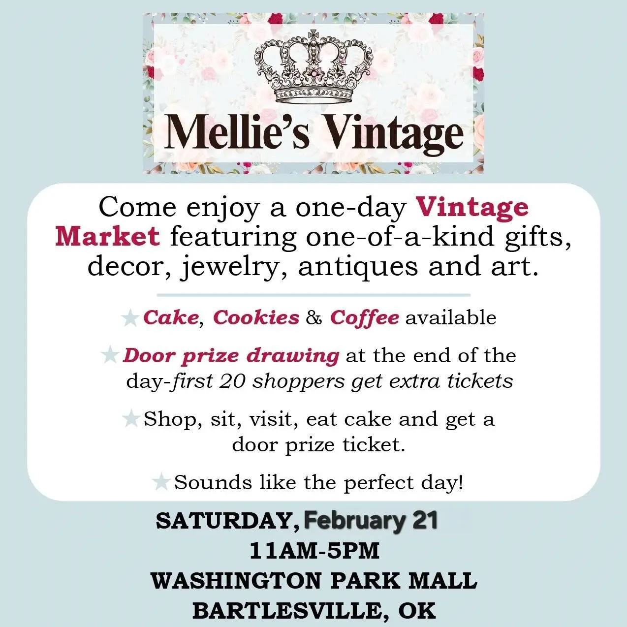 Shop unique finds at the Vintage Market, featuring one-of-a-kind gifts, décor, jewelry, antiques, and art. Enjoy cake, cookies, and coffee while you browse, and don’t miss the door prize drawing!
